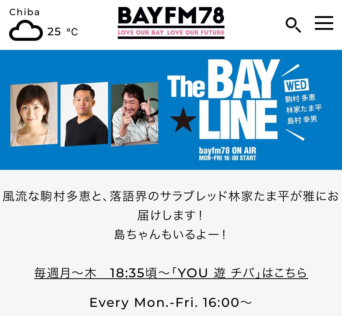7/14(水)17時ごろ8分ほど千葉の幕張bayfmラジオ番組TheBAYLINEに電話で生出演させていただきました。