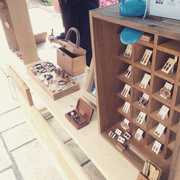 無着色の木のピアス、屋外で展示すると影や直射日光の調整が難しいですね汗