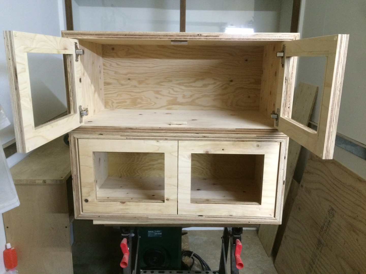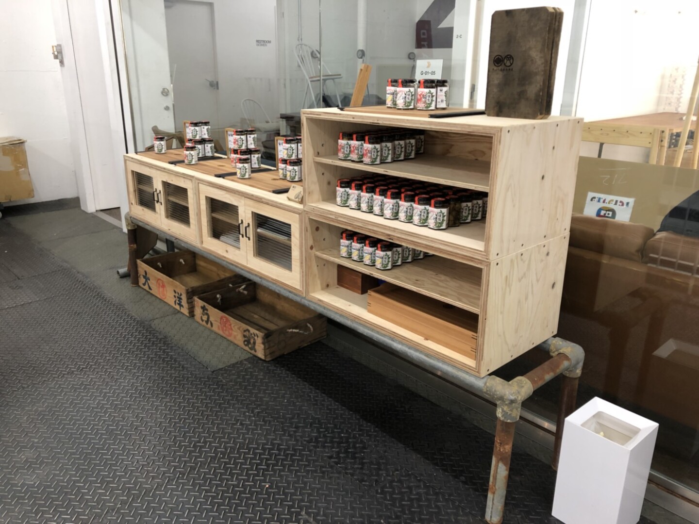 牡蠣やタコのオリーブ漬け瓶詰め等を展示会で見せる為の棚です。 材料はヒノキ、松の構造用合板。 大変丈夫です。