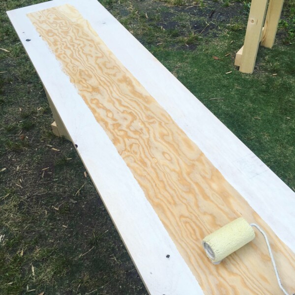 合板の木目を少し見せたくて、シャバシャバに水で薄めたペンキを塗りました。
