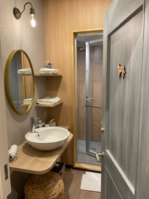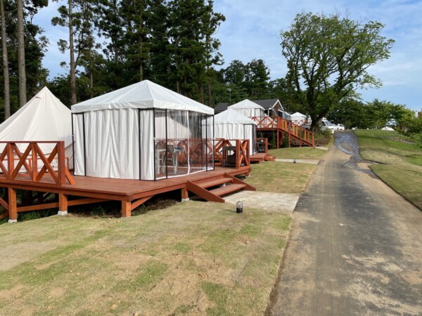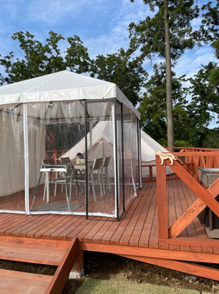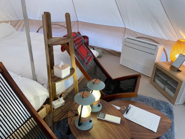 専用の個室シャワールーム、エアコン付きテント、自然ロケーションのど真ん中に滞在できる非日常の贅沢。正に他に類を見ないグラマラスキャンプ。