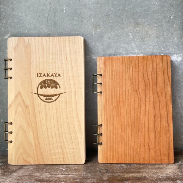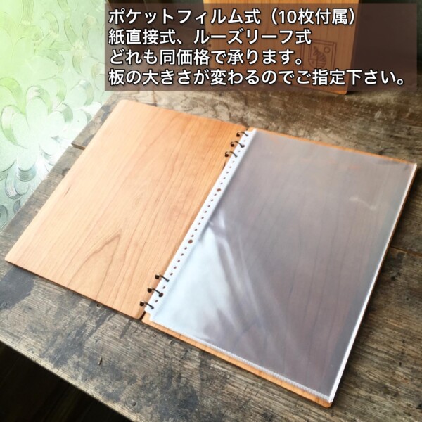 サイズは中に入れるもの(フィルム、紙、ルーズリーフなど)の大きさで変わります。木製 メニューブック