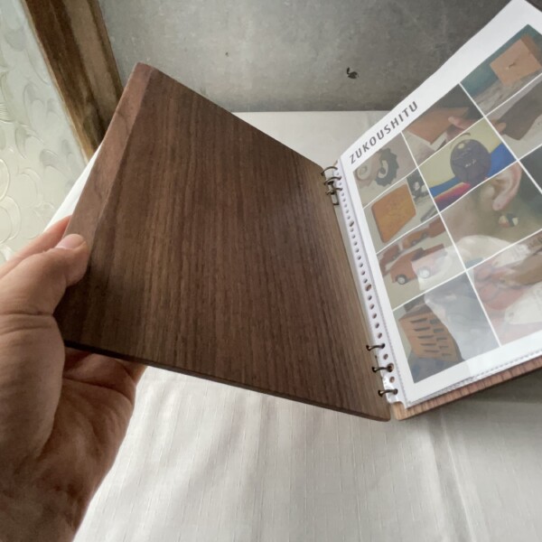 天然木厚板からスライスした、一枚板無垢5mmの木製メニューブック、フォトアルバムです。安価な薄物、貼り合わせ板とは異なります。木目色味も全て異なるのが本物の証。