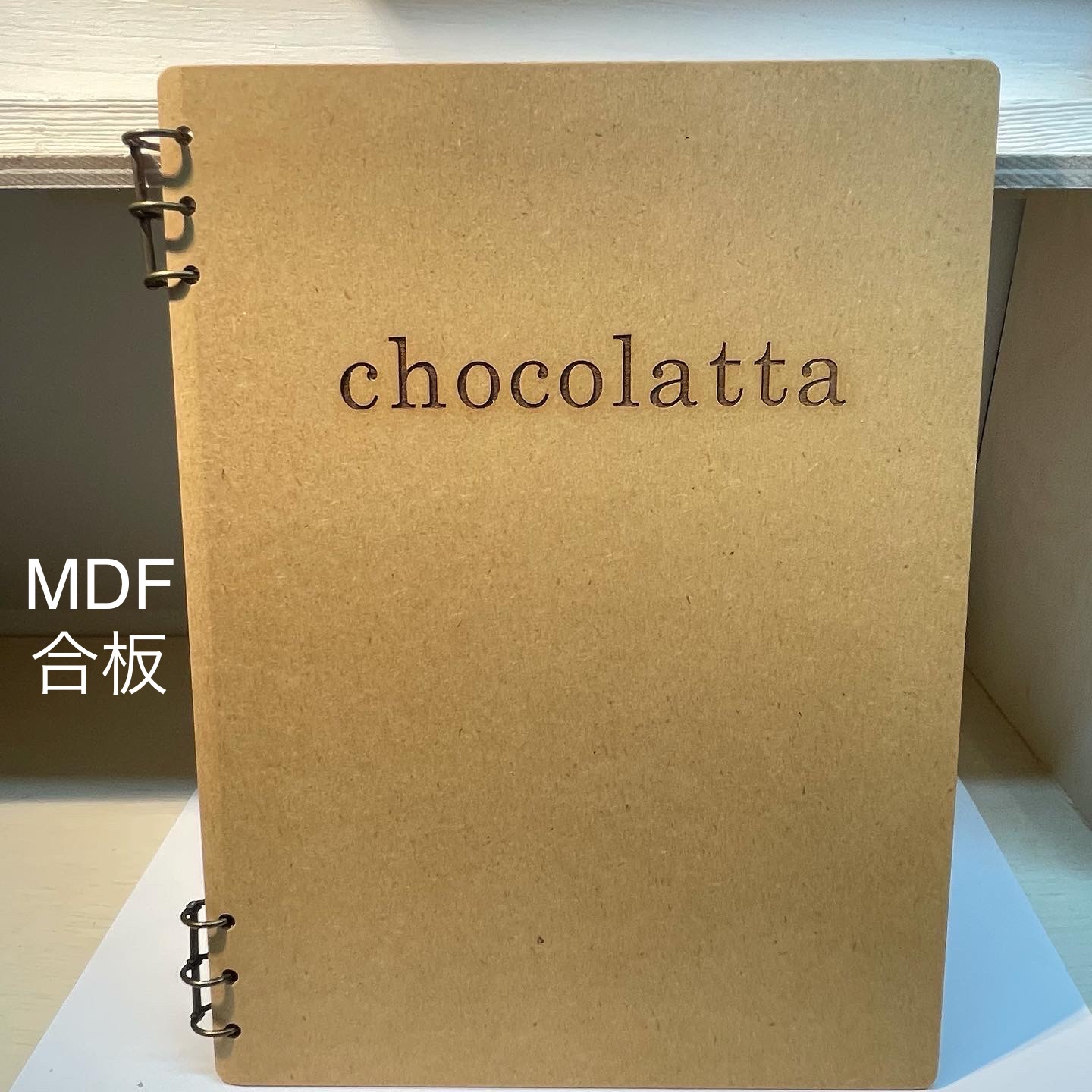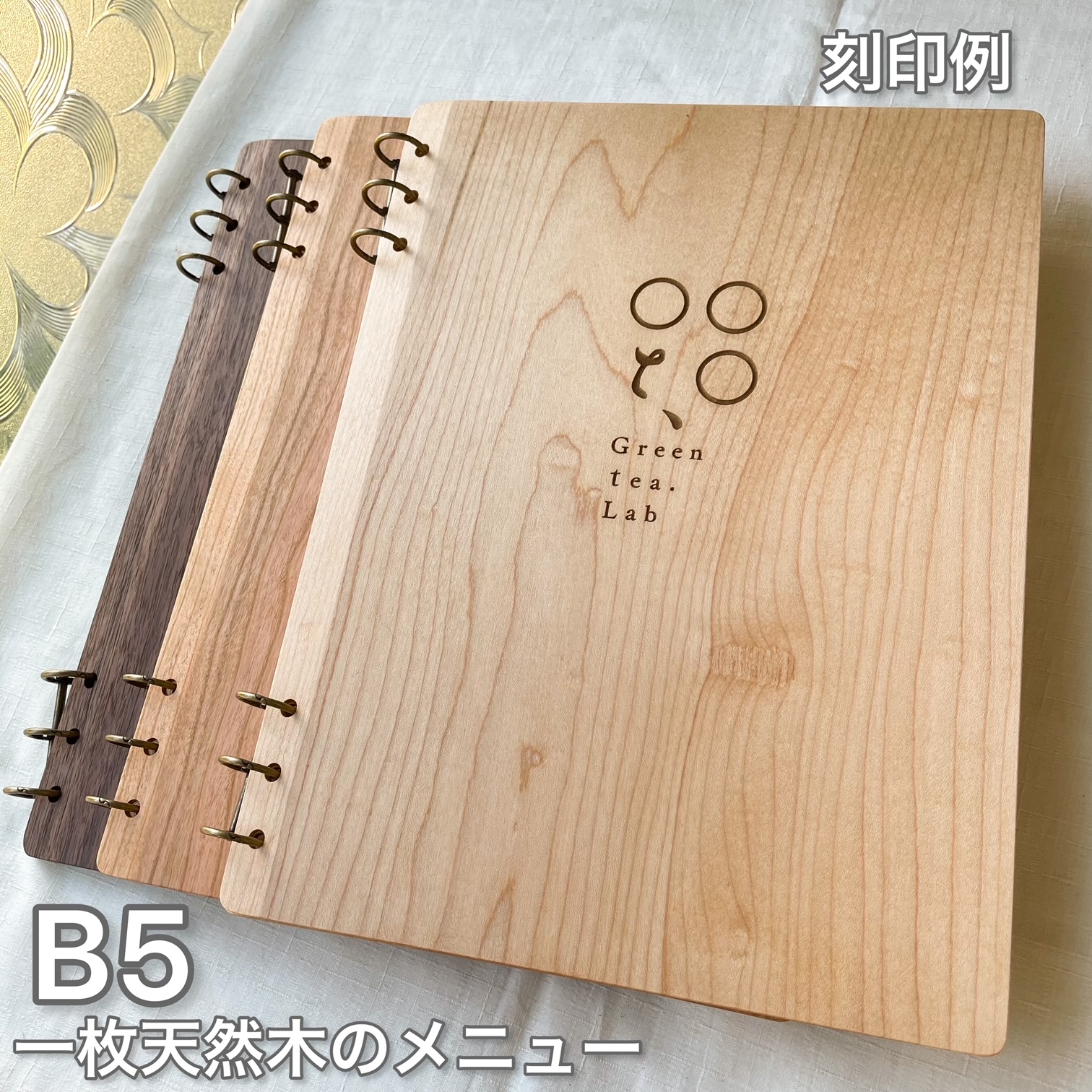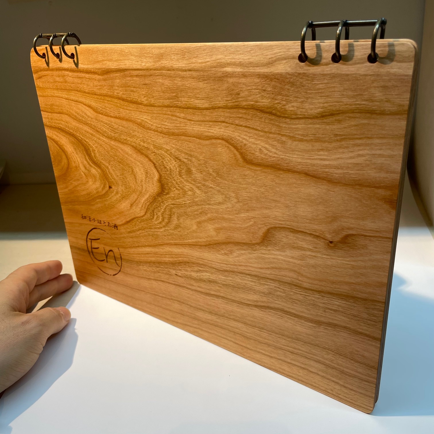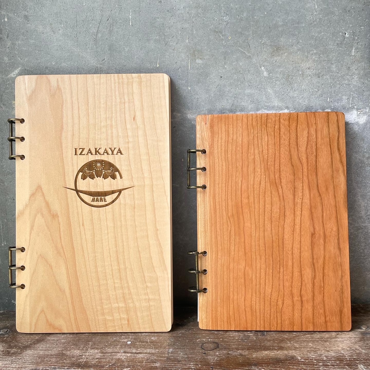木の メニューブック フォトアルバム5mm無垢一枚板。安価な薄皮木目貼り合わせ板とは異なります。色や木目が綺麗な堅木(反りが出やすく加工が難しかった)に、反りを軽減する特殊な塗装方法を採用。「ありそうでない」天然木の色をそのまま活かした、無着色の木製リングメニューです。