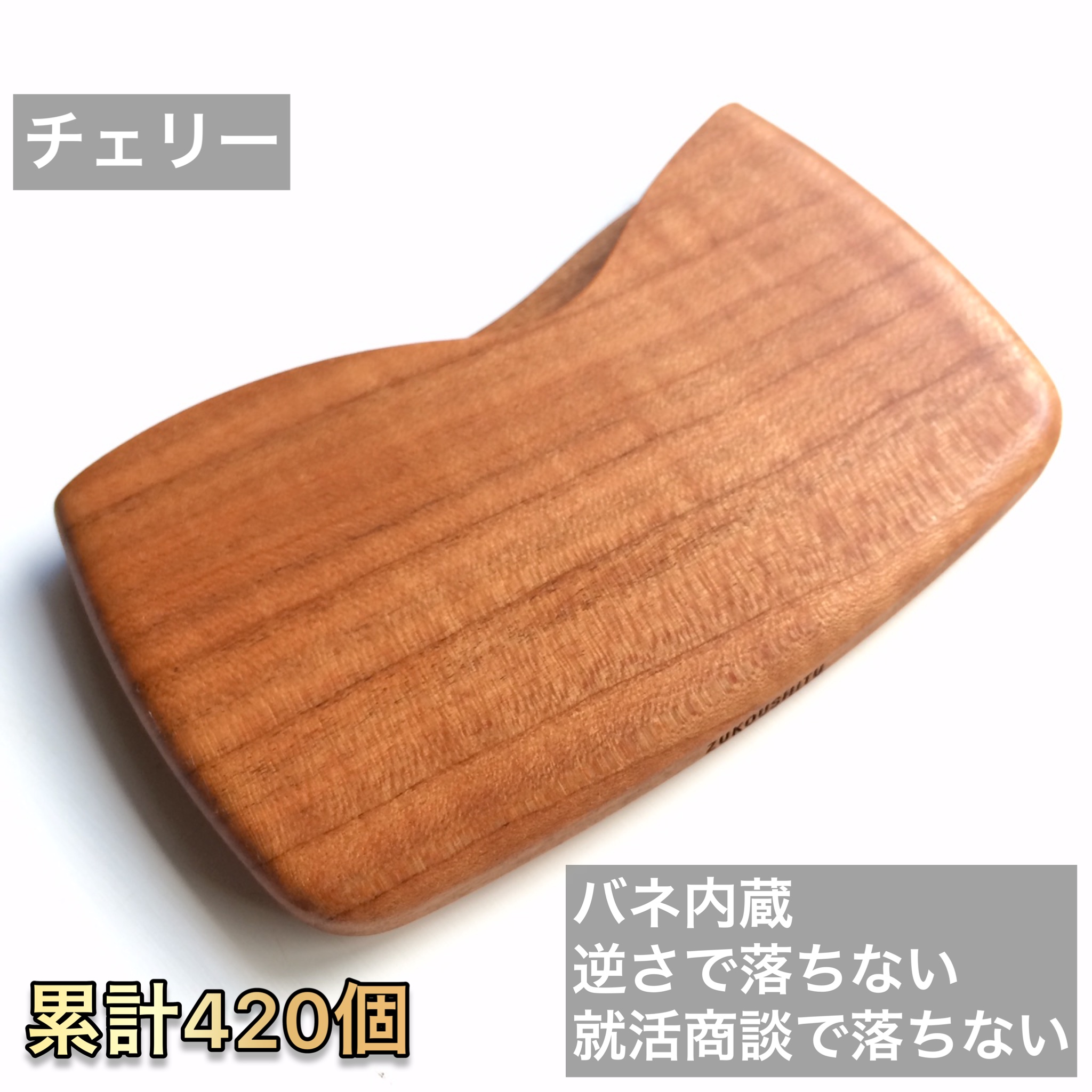 木製無垢削り出し、バネ内蔵で落ちにくく、サッと引き出せる名刺ケース、カードケースです。背面の板も少しだけくぼませて、爪の長い方でも取り出しやすくしました。緩やかなカーブで持ちやすくポケットに入れやすいフォルムです。