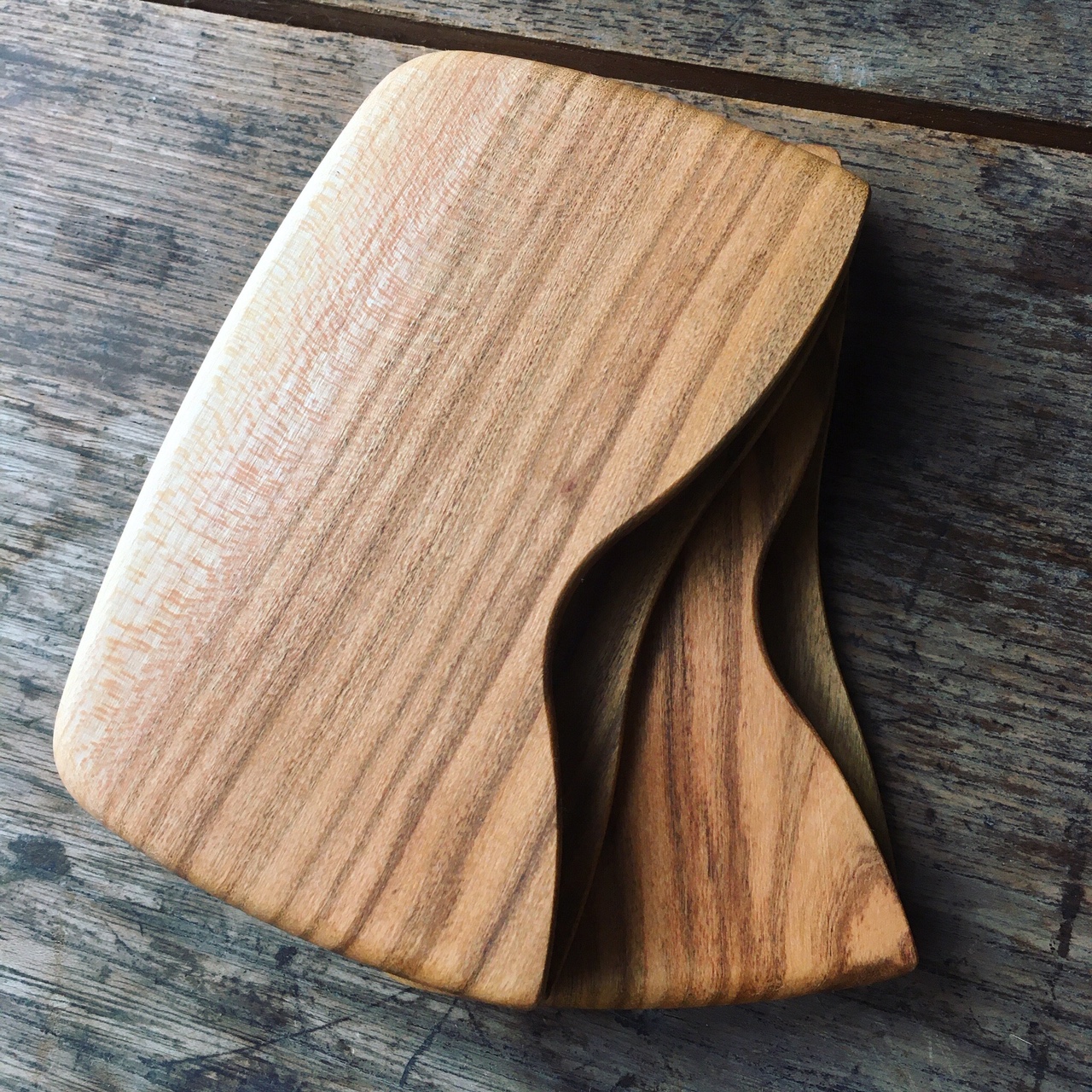 木製無垢削り出し、バネ内蔵で落ちにくく、サッと引き出せる名刺ケース、カードケースです。背面の板も少しだけくぼませて、爪の長い方でも取り出しやすくしました。緩やかなカーブで持ちやすくポケットに入れやすいフォルムです。
