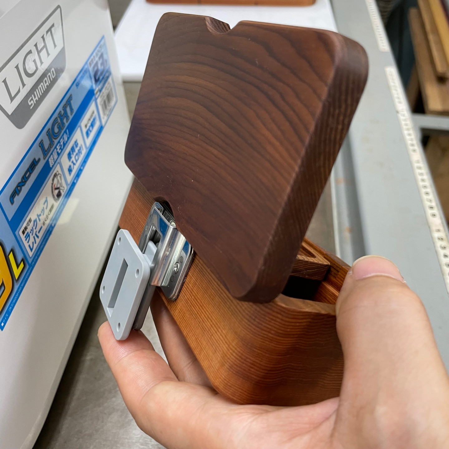 露出の少ない特殊蝶番です。目立たないので大変綺麗です。通常より長く刺さる蝶番ですので使用上問題なく、耐久性もあります。木製キス釣り餌箱