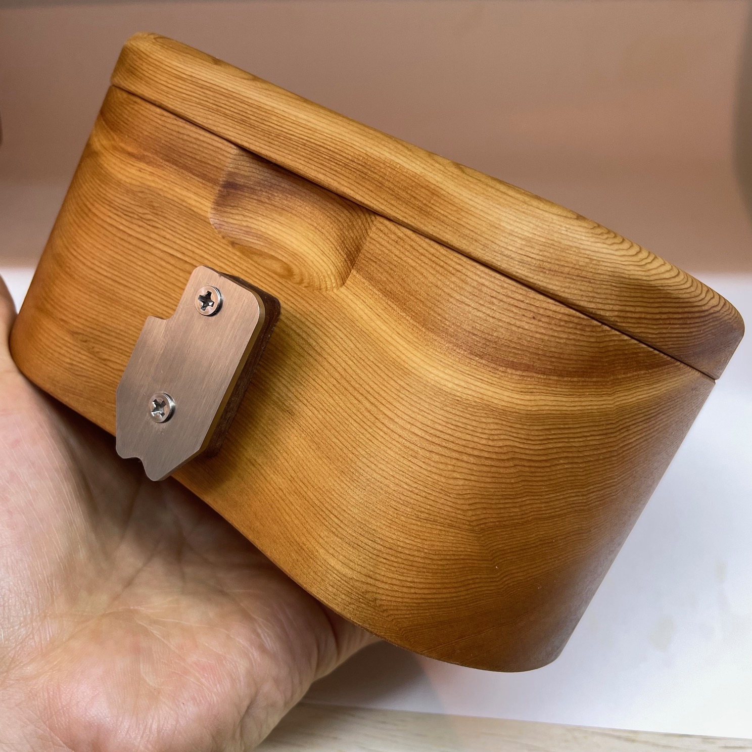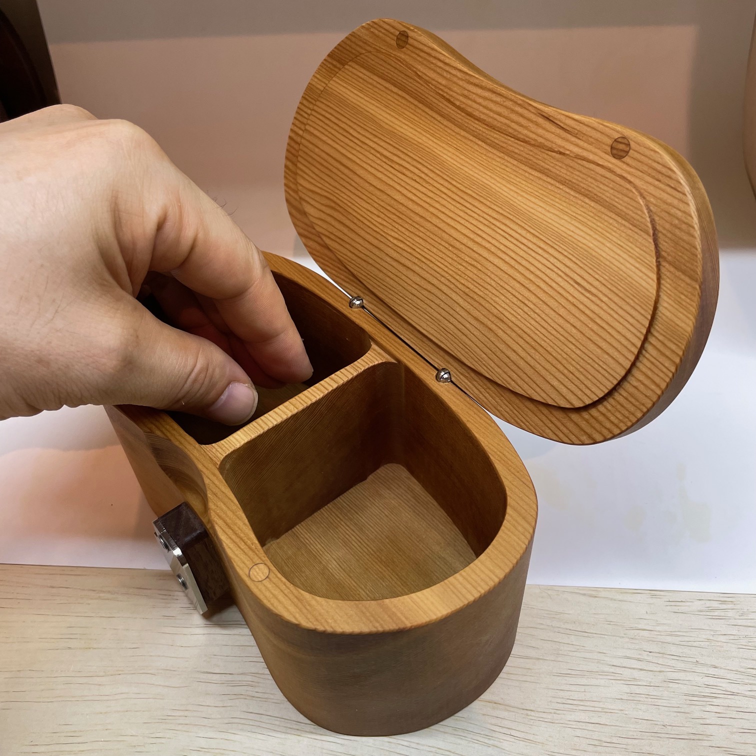 蓋の固定 ・強力ネオジム永久磁石で確実にパチンと閉まります。 ・米杉の埋め木をして磁石を見えない様にしてあります。 ・蓋自体縁周りに1.5mm程度の段差加工がしてありますので、ズレが発生しにくく、中の物が飛び出しにくい仕様となっております。