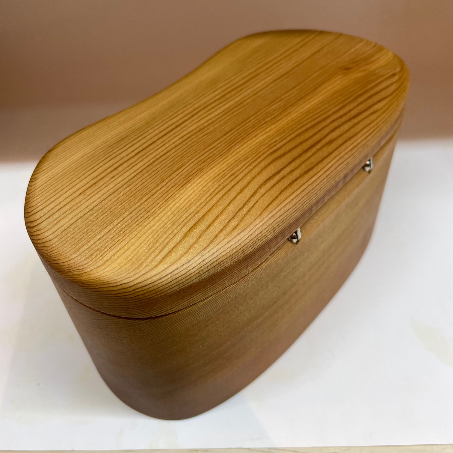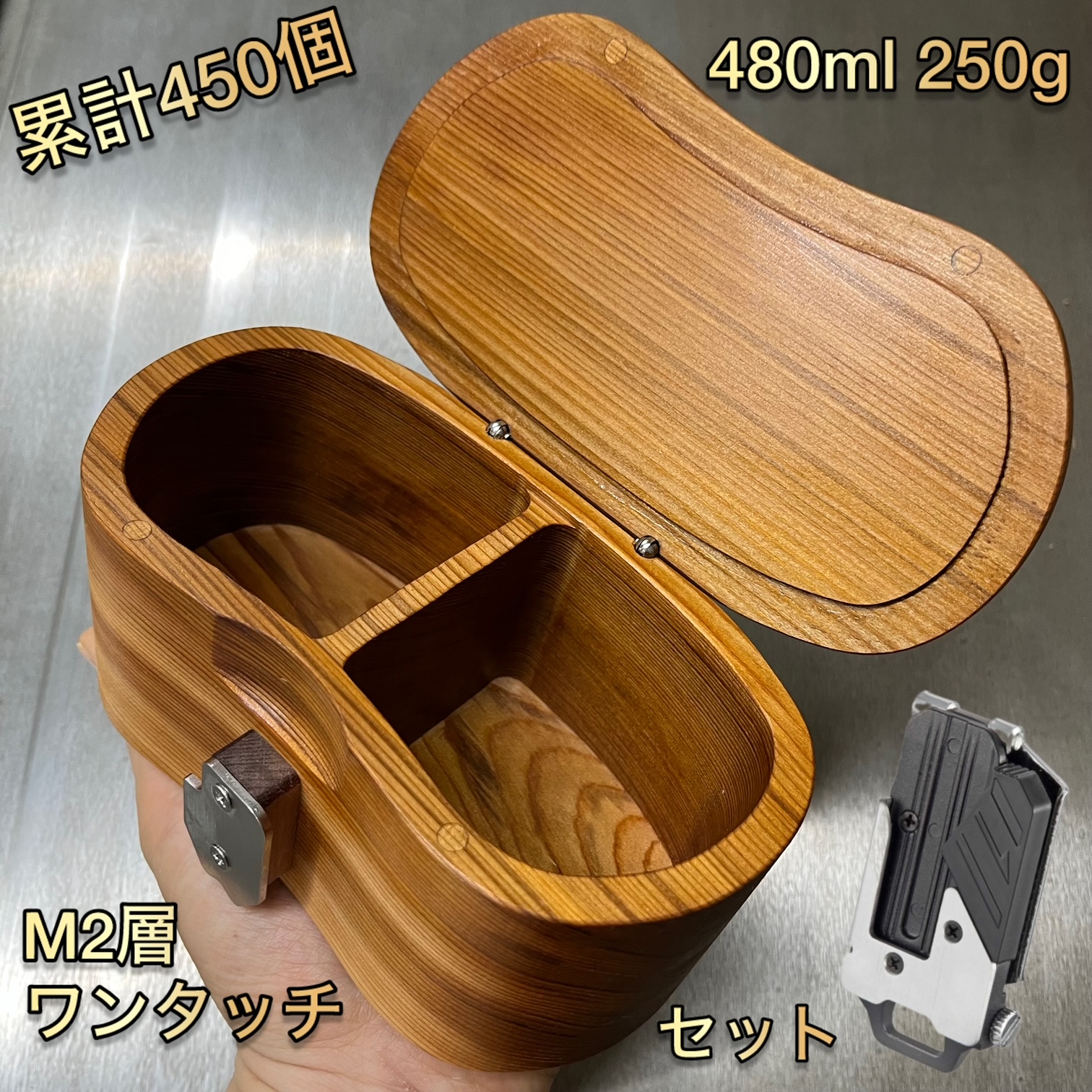 木製 黒鯛 餌箱M二層 金属ワンタッチ 240g前後。軽くて丈夫、腰に優しく、木の調質性と断熱性により餌が長持ちする、美しいフォルムの使いやすい餌箱です。