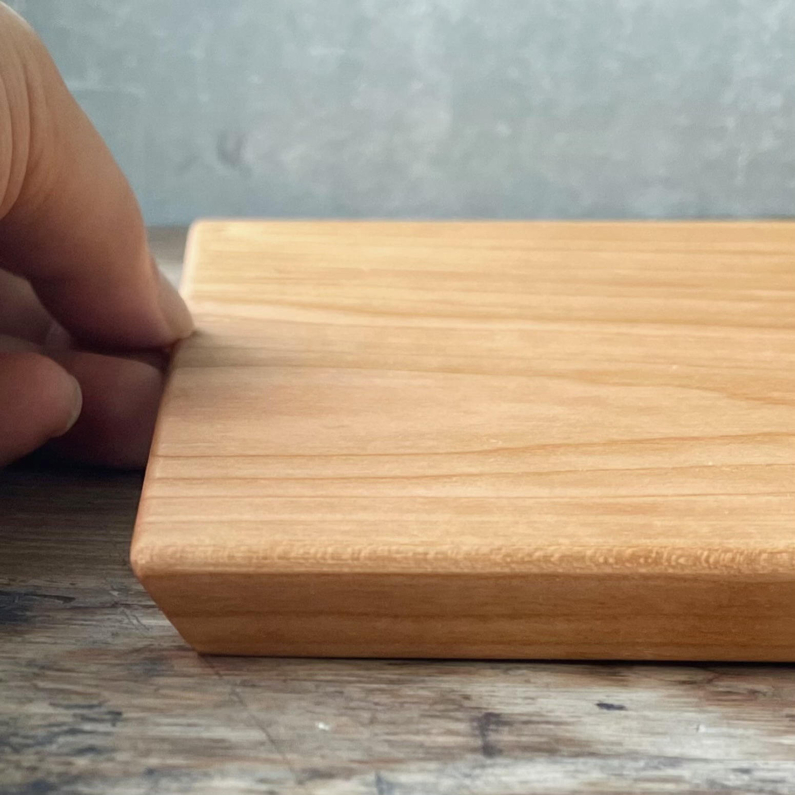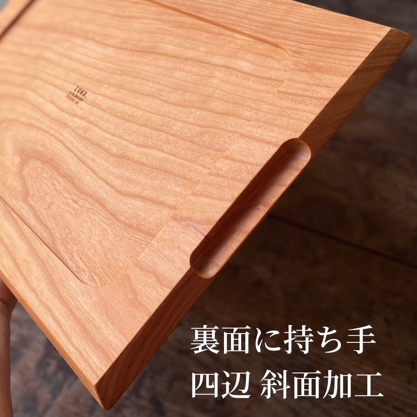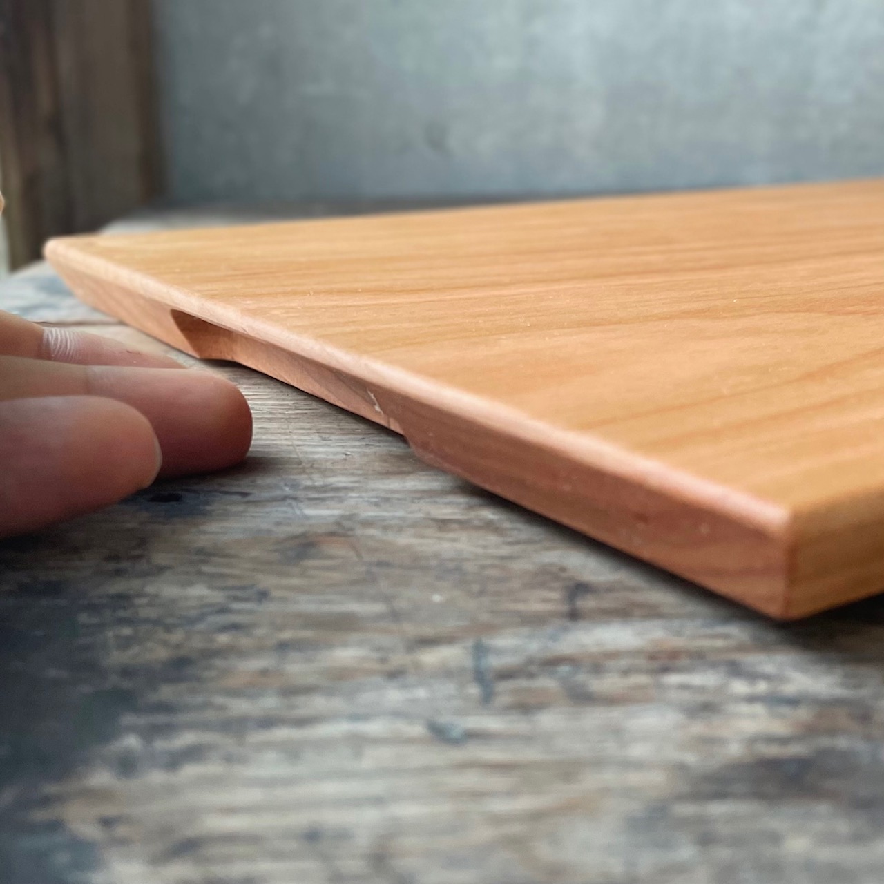 天然木一枚板無垢削り出し、カッティングボード、シンプルでありながら四辺の面取り、裏の斜面加、取手加工など、細かなディテールにこだわりました。シーンを選ばず使いやすさも重視。