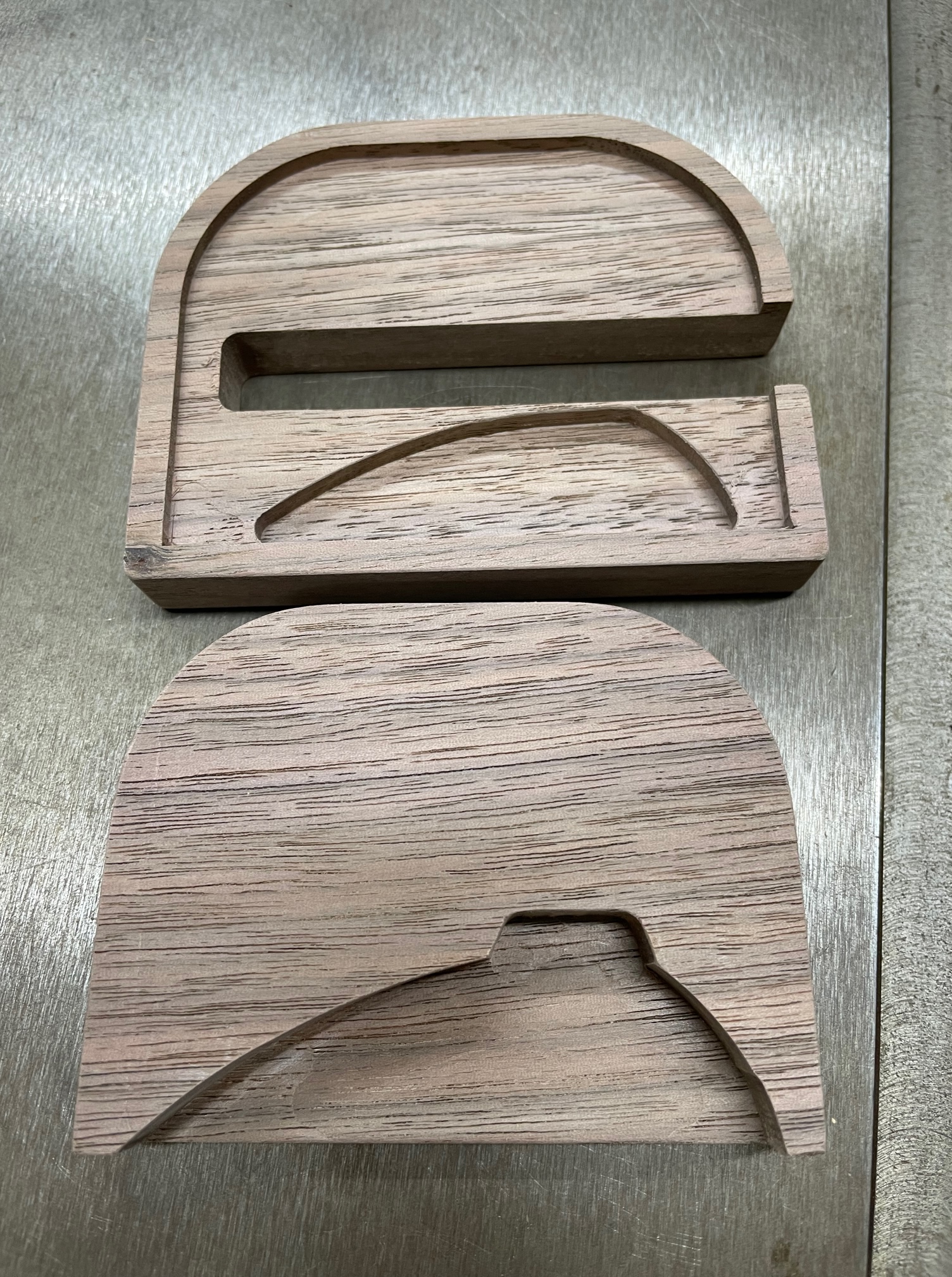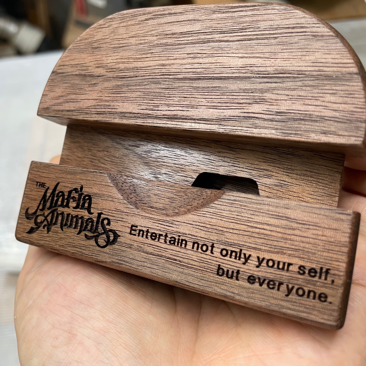 フリックしやすいくぼみ、手前の板が低くなっているので視界を妨げません。スマホスタンド 木製