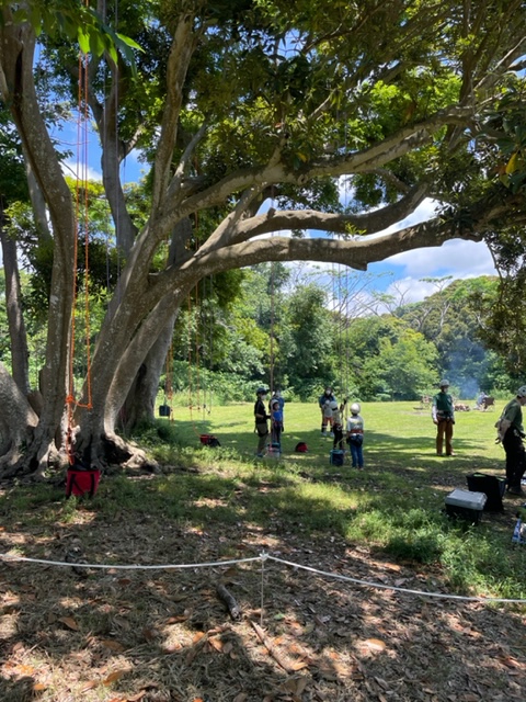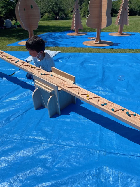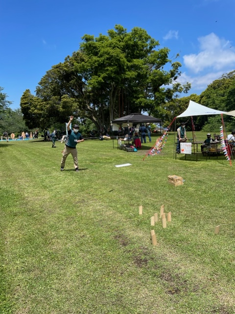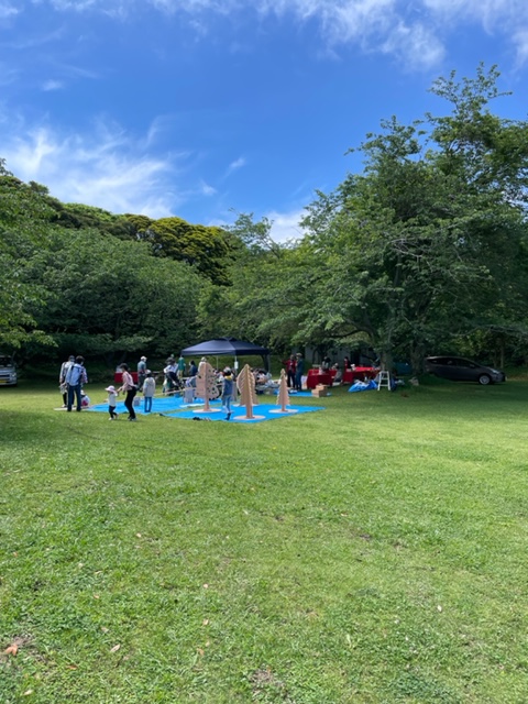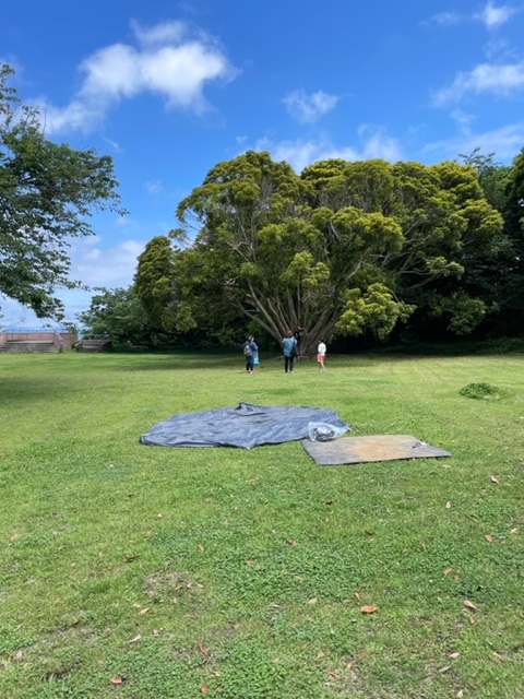 いい天気です♪ お子様達がツリーイングをしているマテバシイの木の前で、地元伐採者様からご提供いただいた同じ大房岬のマテバシイの木の製品を展示させていただきました。(継続可能な地域小循環ビジネスとして売上の約一割を材料代として還元)とても感慨深いイベントでした。