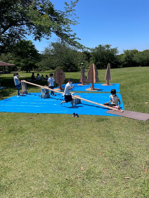 釘やネジを使わない木のジャングルジムづくり。トントン、カンカン楽しそうでした。
