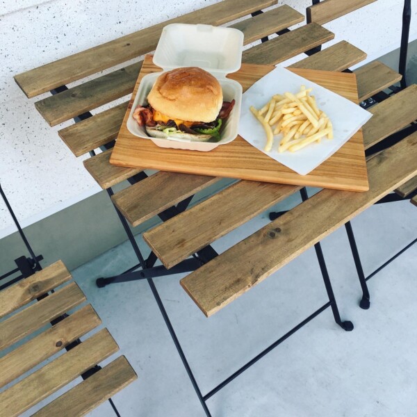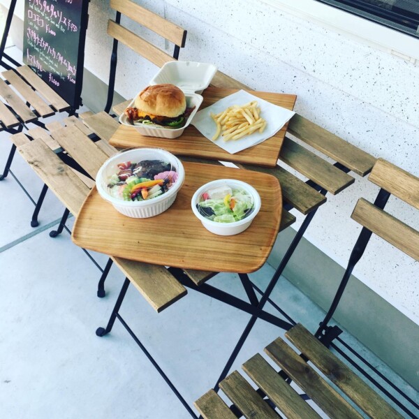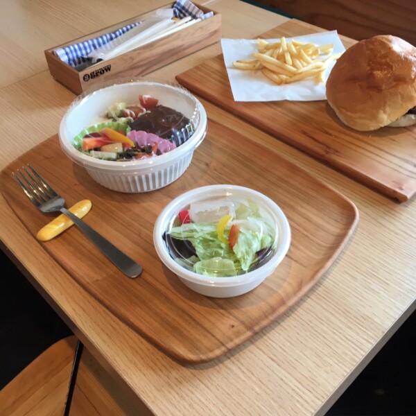 めちゃウマ!ハンバーガーとロコモコのランチセットと、アメリカンブラックチェリーの一枚板無垢削り出しトレー、マルチプレートとコラボさせていただきました。