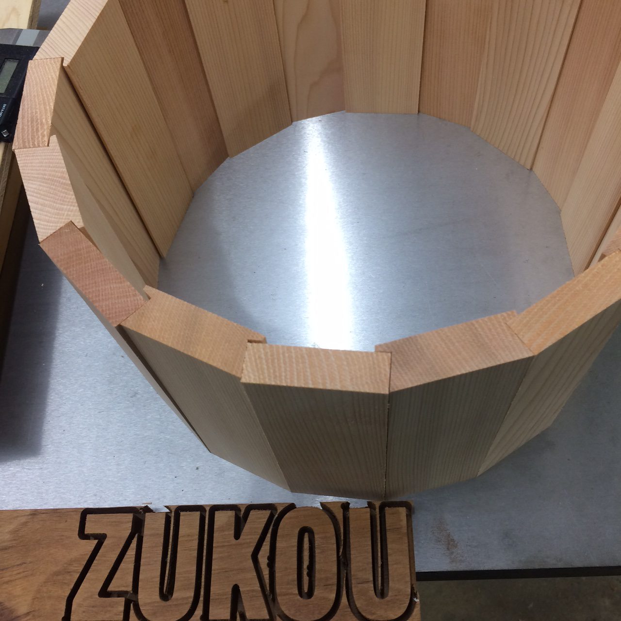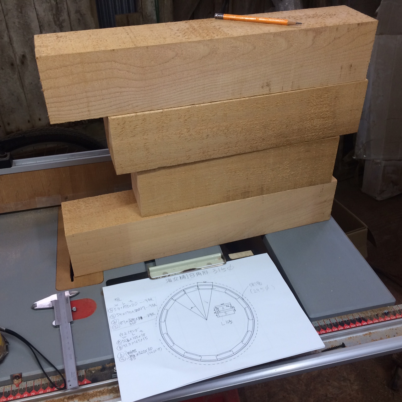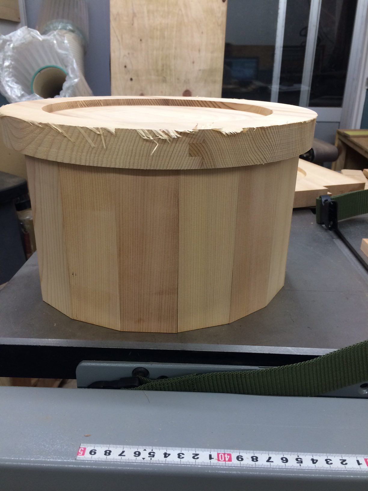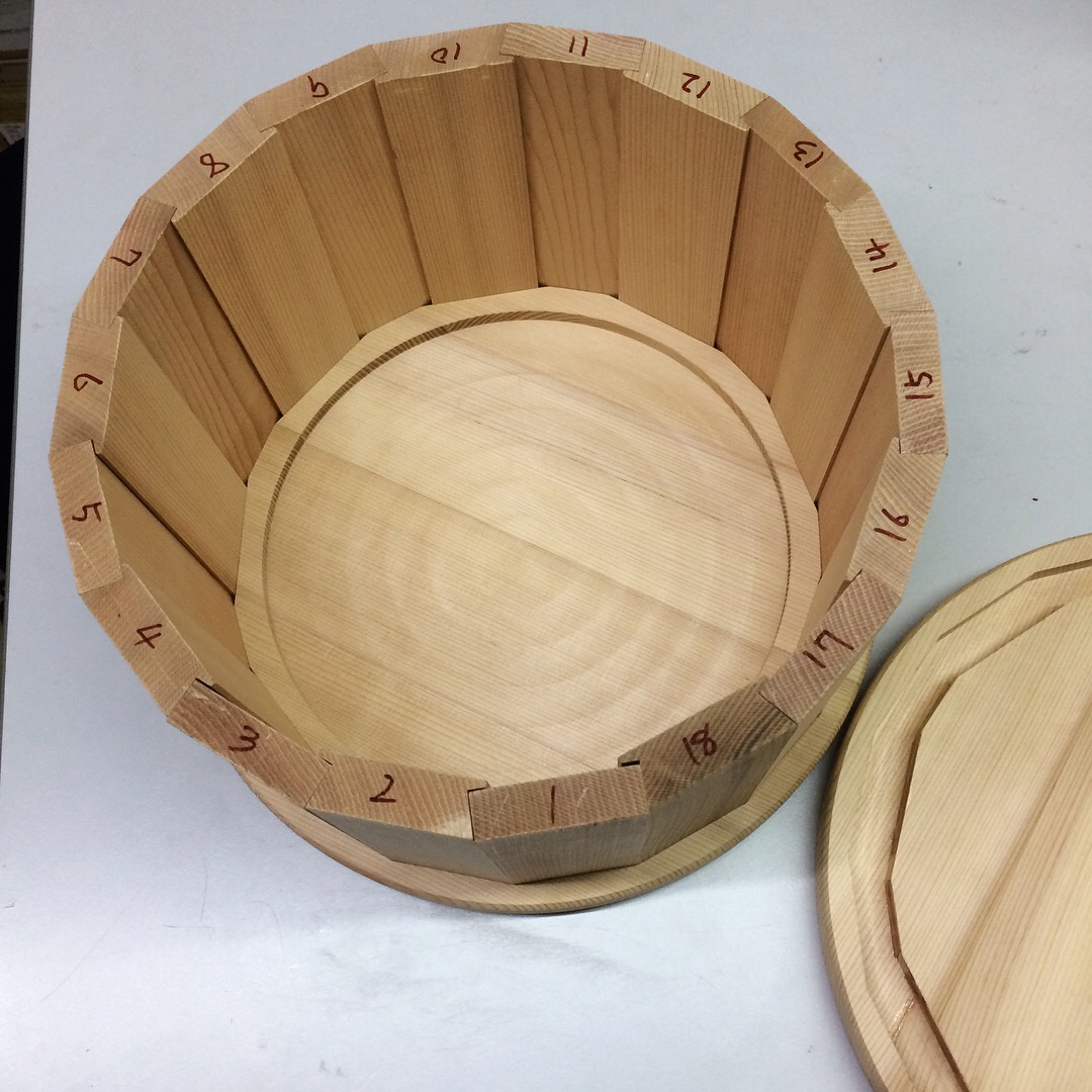 タガの代わりに上下厚板に精密に18角形の溝を掘り、少数第二位まで正確に側面板を丸鋸で切り出しました。