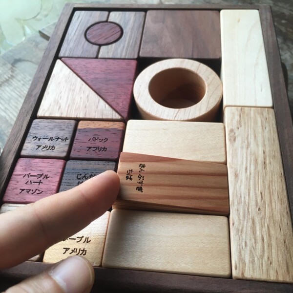 樹種の刻印は樹種ごとにキューブ1個ずつ。裏返して樹種クイズも楽しみの一つです。