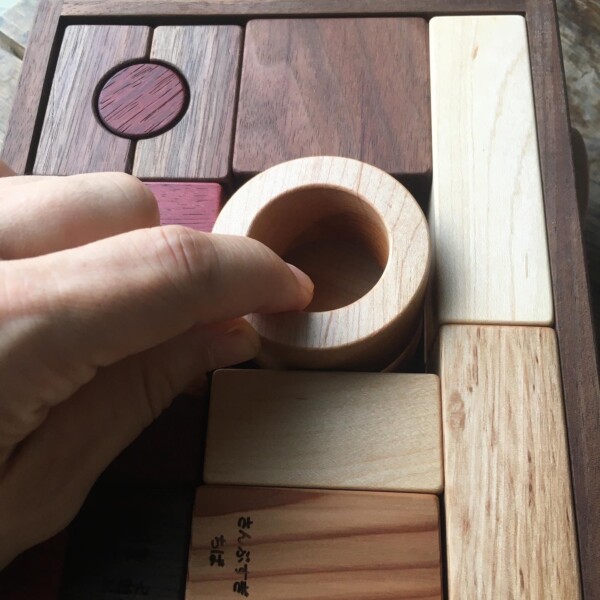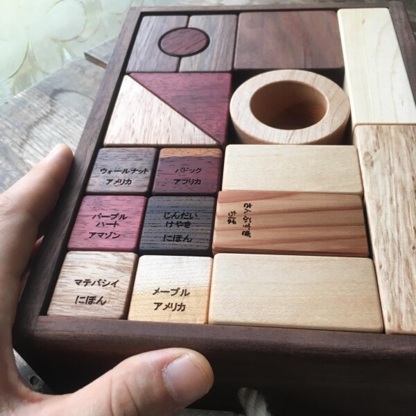 一片だけ針葉樹のちばのすぎを入れてみました。硬木ってこんなに重いんだ、マテバシイって一番ツルンとしていて陶器みたいかも!世界の銘木と日本の木の相乗効果で、色や重さ、肌触りの特徴が遊びながら自然に掴める積み木でもあります。