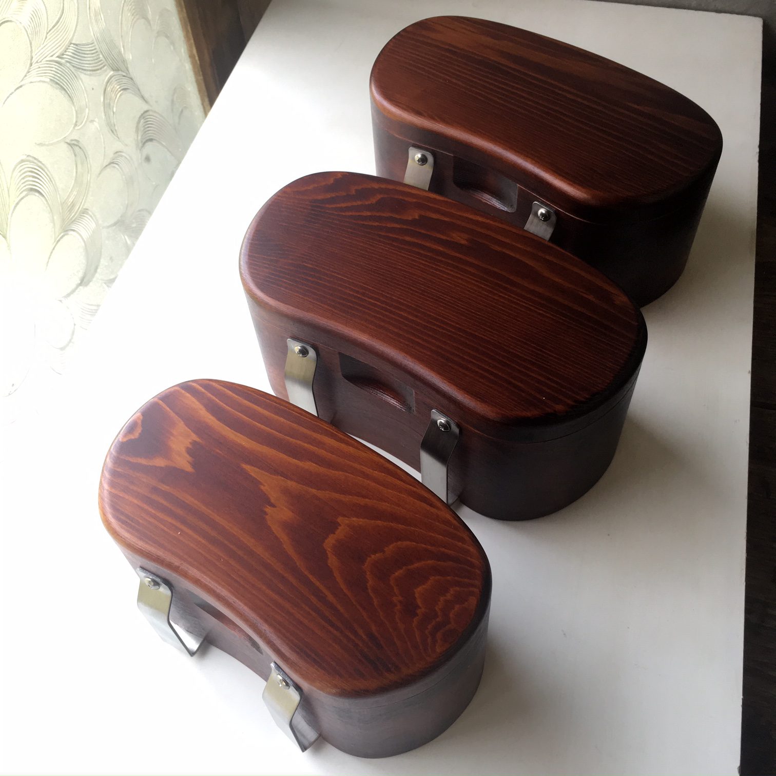 (蓋開け上の写真、奥からL一層、L二層、Mサイズの各一点)